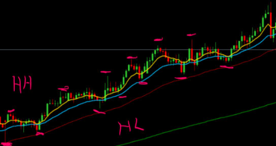 FIG6 This image shows on the left the change in trend from LL and LH to HL and HH confirmed by a 20 and 50 EMA crossover with price interacting with the 20EMA and cycles continuing until LH and LL on the right of the image (4hr chart)