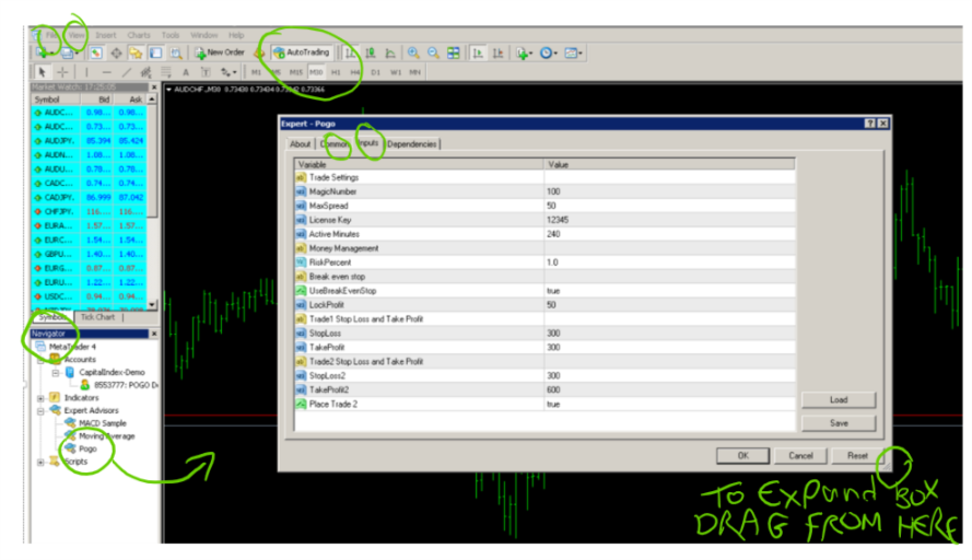 When you see the set up on the 4hr chart in any forex instrument you place POGO onto the 30min chart. It will wait for the right set up in accordance with the strategy on the 30min chart and when the right set up occurs – POGO will place trades.