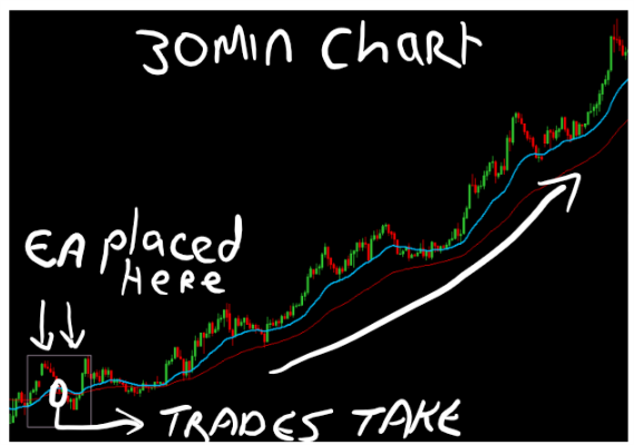 1) 20 and 50 EMAs to be in the same order as the 4hr (the set up of the EMAs on the 4hr will let the EA know if it is a buy or a sell it is looking for. So if the 20 is above the 50 it will be looking for a buy set up and therefor needs the 20 above the 50 on the 30min